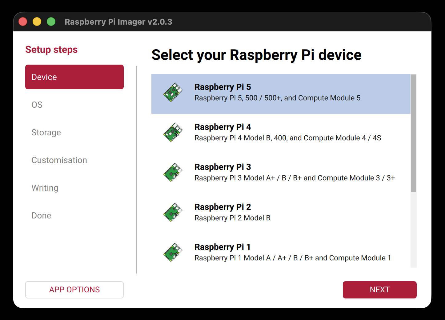 - For the device, select your Raspberry Pi model (Raspberry Pi 5)